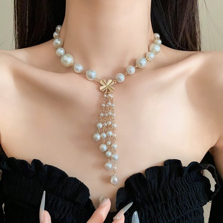 Artificial pearl and flower tassel necklace