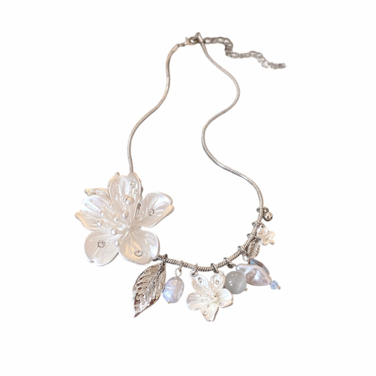 Diamond encrusted flower and pearl leaf necklace