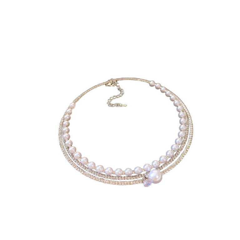 Multi layered diamond encrusted zircon artificial pearl round necklace