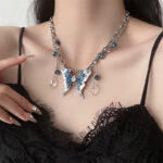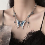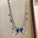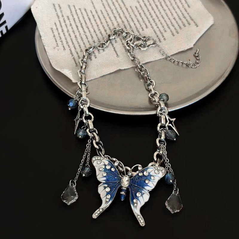 This blue enamel butterfly necklace originated in 1990s Tokyo’s gothic-lolita subculture: a young artisan crafted it, using deep blue enamel (echoing twilight skies) and delicate chains to honor her late friend—who’d loved butterflies as symbols of “transient, vivid beauty.” The dangling crystals mimic dewdrops, as if the butterfly had just alighted from a moonlit garden.