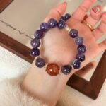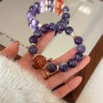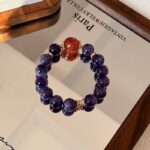 This Natural Dreamy Amethyst & Red Flower Agate Bracelet was crafted in 2024 by a Bali crystal healer, for a traveler who struggled with insomnia after long journeys. The deep purple amethyst is said to calm restless thoughts, while the warm red flower agate anchors the spirit, and the gold accents catch light like quiet hope.