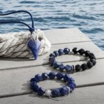 With blue dumortierite and silver charms, it’s a versatile piece that encourages confidence and adds a masculine touch.