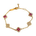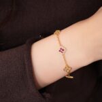 The gold chain mirrors the thin grout lines of Lisbon’s tiles, while the red zircon flowers (mimicking the deep hues of the district’s geraniums) and clear zircon blooms (echoing the white accents in her grandmother’s work) were set to feel like tiny, wearable tile fragments. The maker designed the bracelet to be lightweight, so her grandmother could wear it comfortably every day.