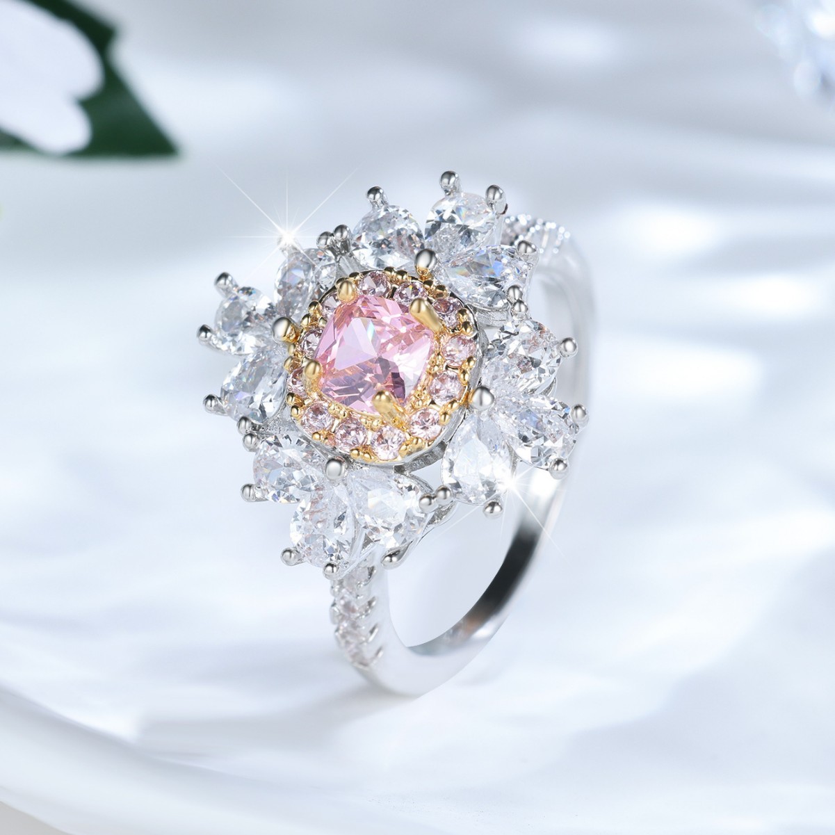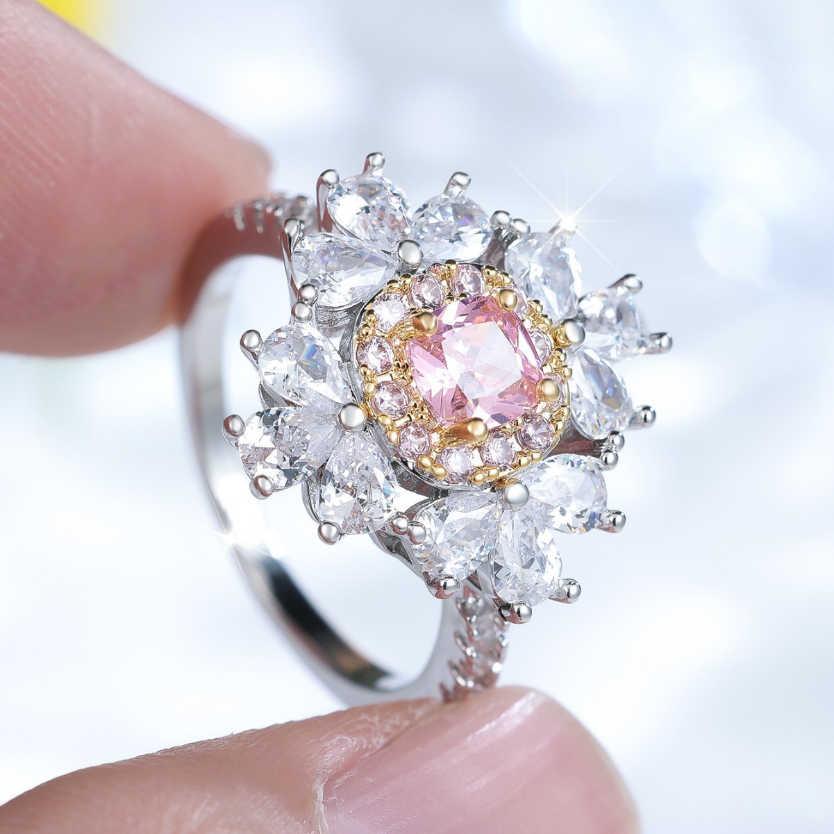 This Shein two-tone gold pink diamond ring originated in 2020’s global fast-fashion creative studios: a designer crafted it for a freelance stylist, who wanted a piece that “blended high-lux vibe with everyday playfulness.” The pink center stone nods to soft romance, while the two-tone gold (warm yellow framing cool silver) and clustered diamonds add a bold, accessible glamour—perfect for mixing into both casual and dressy looks.