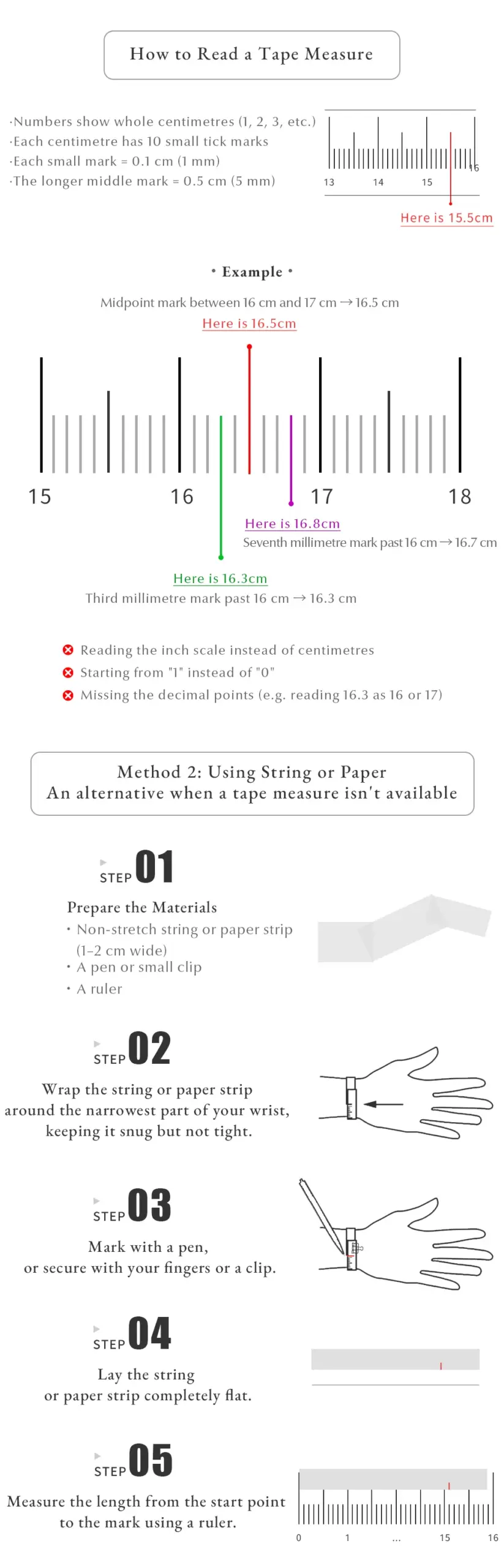 Note: As each piece is handcrafted, slight variations may occur. If your wrist measurement falls between sizes, we recommend selecting the more tailored fit for a secure feel. |